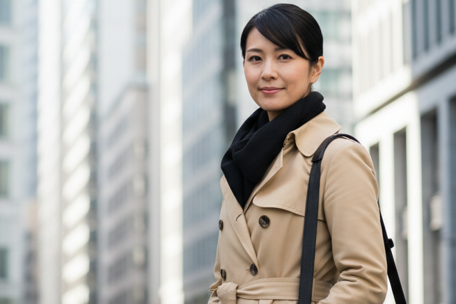 通勤には、シンプルで上品なデザインがおすすめです。無地やチェック柄なら、どんなコートにも合わせやすい。